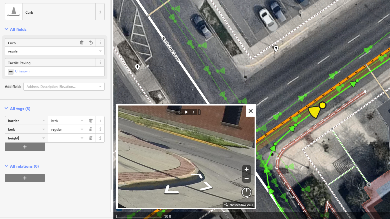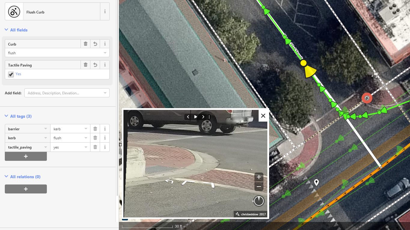 This is the beginning of the curb as a discrete feature on the map. Using OSM iD editor in a downtown area, we can spot a curb in the nearest Mapillary image, then follow the curb outline using Digital Globe Premium basemap. It can be marked as a regular curb, while it’s not certain if the brick edge counts as tactile. When noting the height, there’s a clear need to physically measure the particular curb. This curb and the one across the street are both yellow, indicating no parking is allowed—but there’s currently no way to indicate this in OSM.