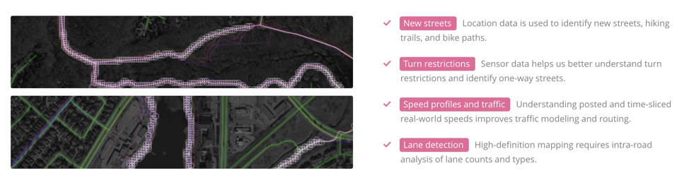 Device-collected location data is critical to constantly improving the mapping products we depend on every day. Mapbox SDKs collect encrypted, anonymous, and aggregated data about the map and device location so that we can help developers build better location-based applications. Anonymous sensor data helps find missing roads, determine road speeds and traffic, and classify biking and walking transit routes in cities. This data contributes to a better map of our world for users.