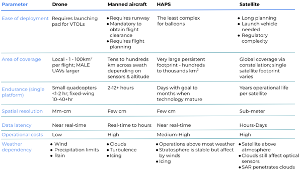 Closer to the ground, drones capture quickly fine-scale, high-resolution imagery or provide local situational awareness, while manned aircraft provide real-time coordination services. Table 1 compares the main parameters of these four complementary data sources.