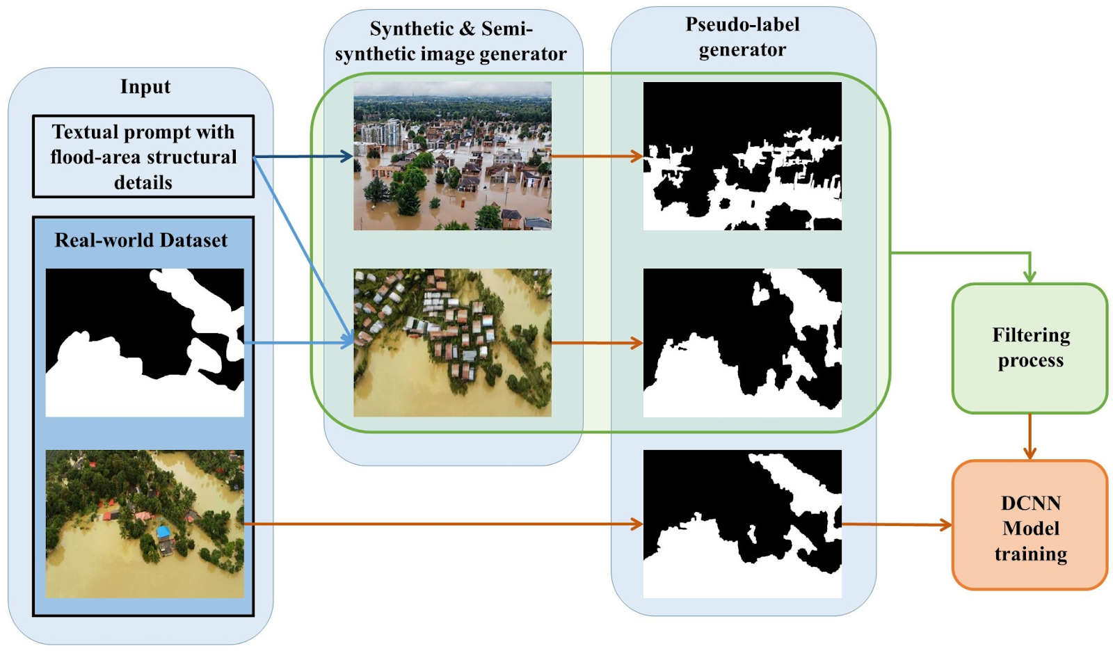 Sample Methodology using synthetic flood images. Source: Simantiris et al.,2025