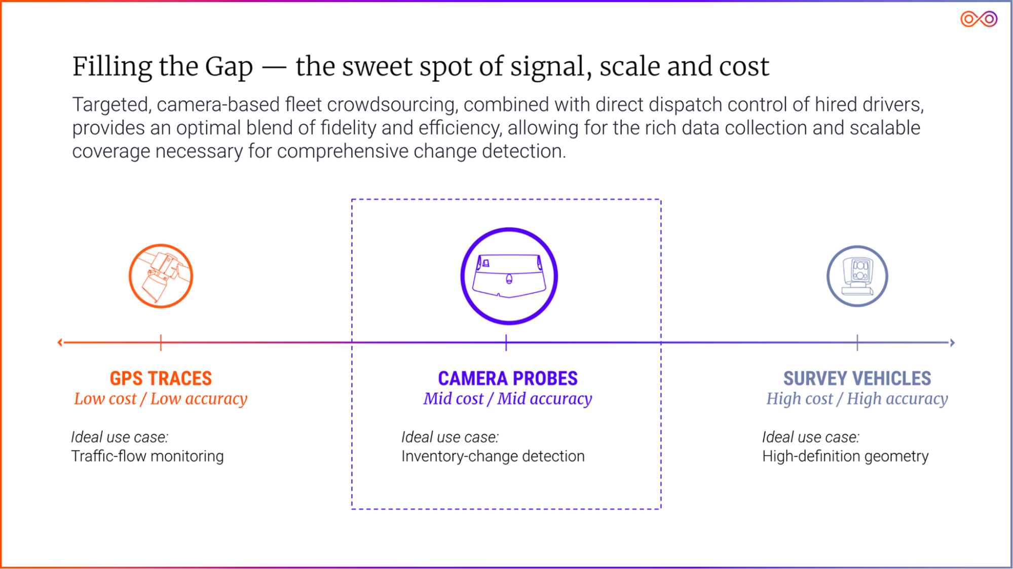 As I sort of alluded to before, costs really become an issue when you’re talking about maintaining maps. The prevailing current solution, namely, rescanning roads with LiDAR survey rigs (selectively or en masse) is untenable by roughly a factor of 100x cost per mile. That’s really where we’re seeing the innovation. There are a lot of approaches: aggregated consumer vehicle data, which I already mentioned; aerial/satellite-assisted mapping; and so on. We think incorporating fleet video–based updates as well represent the ideal, holistic balance of fidelity, speed and cost at scale.