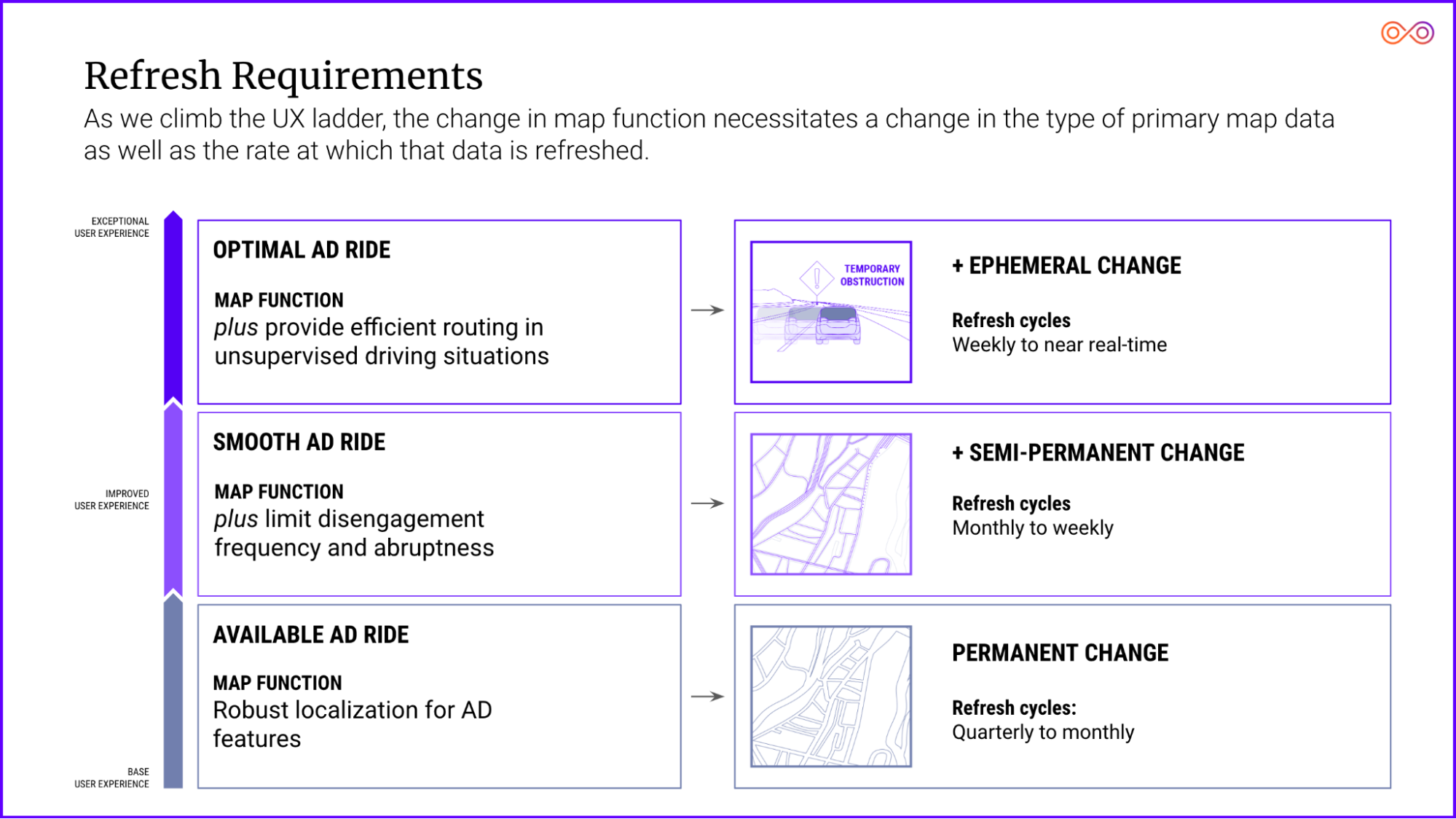 Primarily, the update cadence is really dependent upon the customer’s needs, which, in turn, is usually a function of the type of change and the operational driving domain they’re interested in. Street construction in a very complex city, like New York, for example, needs a much higher refresh rate than something that happens very infrequently, like architectural change on a highway in rural Montana.
