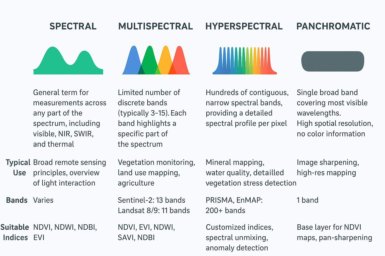 Not all satellite sensors see the Earth in the same way. Some capture just a few broad slices of the spectrum, while others record hundreds of narrow bands. This distinction — spectral, multispectral, and hyperspectral data — determines how much detail we can extract about vegetation, water, soil, or urban areas.