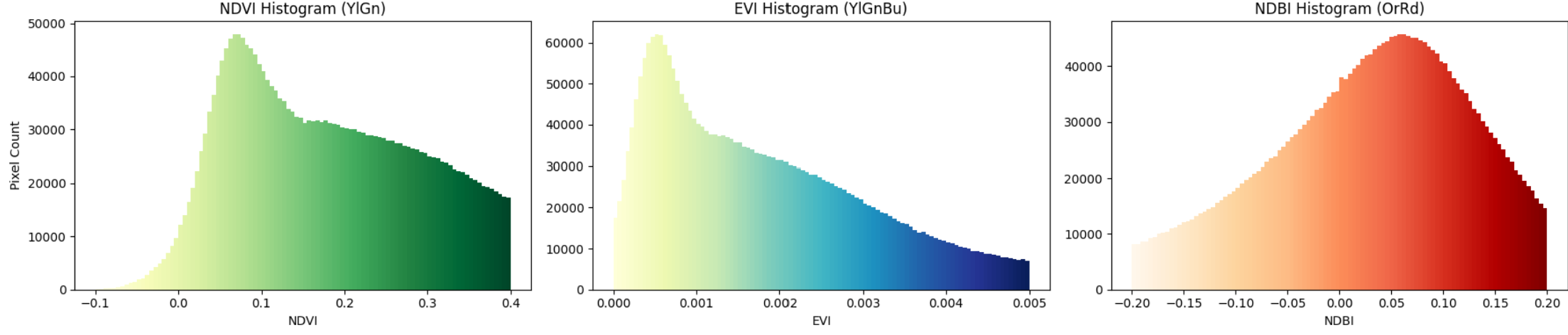 For example, NDVI measures vegetation health by comparing near-infrared and red light reflectance. High NDVI values indicate dense, healthy vegetation. EVI: Similar to NDVI but optimized to reduce atmospheric and soil background influences, providing enhanced sensitivity in high biomass regions. NDBI: Highlights built-up or urban areas by contrasting the shortwave infrared and near-infrared bands.