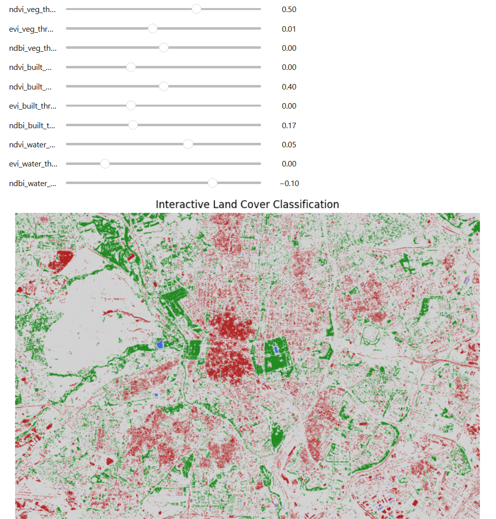 An interactive tool was developed to experiment with different threshold values for NDVI, EVI, and NDBI. This interface allows users to adjust slider controls corresponding to each index’s classification threshold and immediately visualize the impact on land cover maps. By testing various combinations, users can optimize the classification scheme to best reflect real-world land cover patterns.